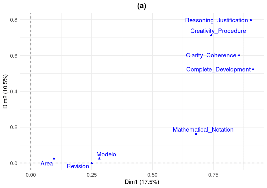 Figure 1. MCA biplot of evaluation criteria across dimensions 1 (17.5% variance) and 2 (10.5% variance). Proximity between points indicates association strength. Dim1 captures overall performance quality; Dim2 captures reasoning quality variation. Points represent category centroids for AI models (Modelo), mathematical domains (Area), review status (Revision), and performance evaluation criteria. For complete statistical details, including all loadings, eigenvalues, and cos² values, please refer to the supplementary material tables.