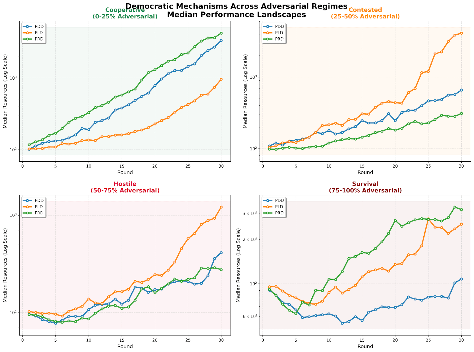 The defensive mechanisms in the evaluation were three different democratic mechanisms: direct democracy (every agent votes on resource allocation), representative democracy (elected decision-makers), and liquid democracy (flexible delegation based on performance). The adversarial agents were LLMs prompted in-context to sabotage outcomes while seeming reasonable. We varied the proportion of adversarial agents from 0% to 90% to see how each democratic mechanism holds up under increasing adversarial pressure. Each setup ran for multiple rounds with noisy prediction market signals providing information about which resource allocation choices might work best.