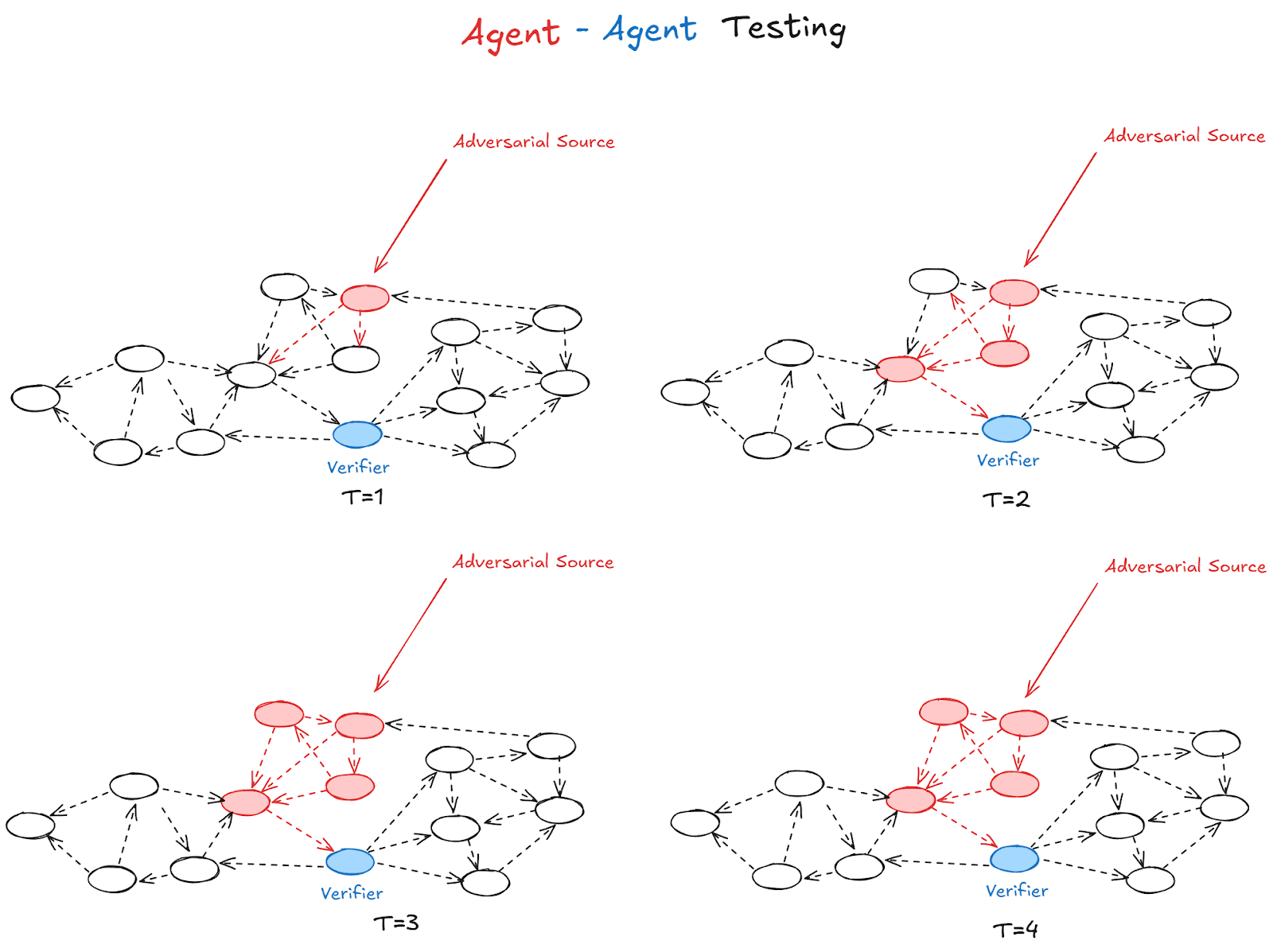 An agent vs agent evaluation can be pictured as a graph, where you have an adversarial source that starts spreading itself (immunology model) until it meets the resistance of an immune verifier agent. This is one of many more models of agent-agent evaluations that one can run.