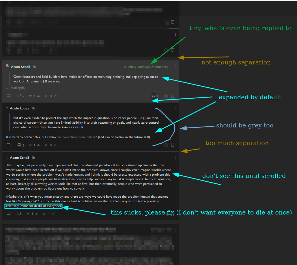 I don’t know how to interpret what’s going on when I’m only shown a subset of comments in a feed section and they don’t seem to be contiguous. Usually I feel like I’m missing context, fumble around with the controls that seem related to the relationships between comments to try to open the intervening ones, still can’t tell whether I’m missing things (I think the indentation behavior is different? How do I tell how many levels there are between two comments that look like they have a parent^N relationship?), and wind up giving up and trying to find a good thread parent to see in its entirety.