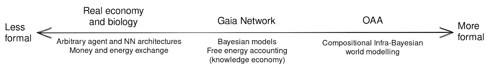 The second key difference between OAA and Gaia is that Gaia doesn’t demand formalising and strictly specifying various pieces of the system (models and their composition structure, preferences and their relative ordering, and constraints) to work and tangibly reduce the global risks. On the formalism spectrum, Gaia is between the real economy and biology on the “informal” side, and OAA on the “formal” side: