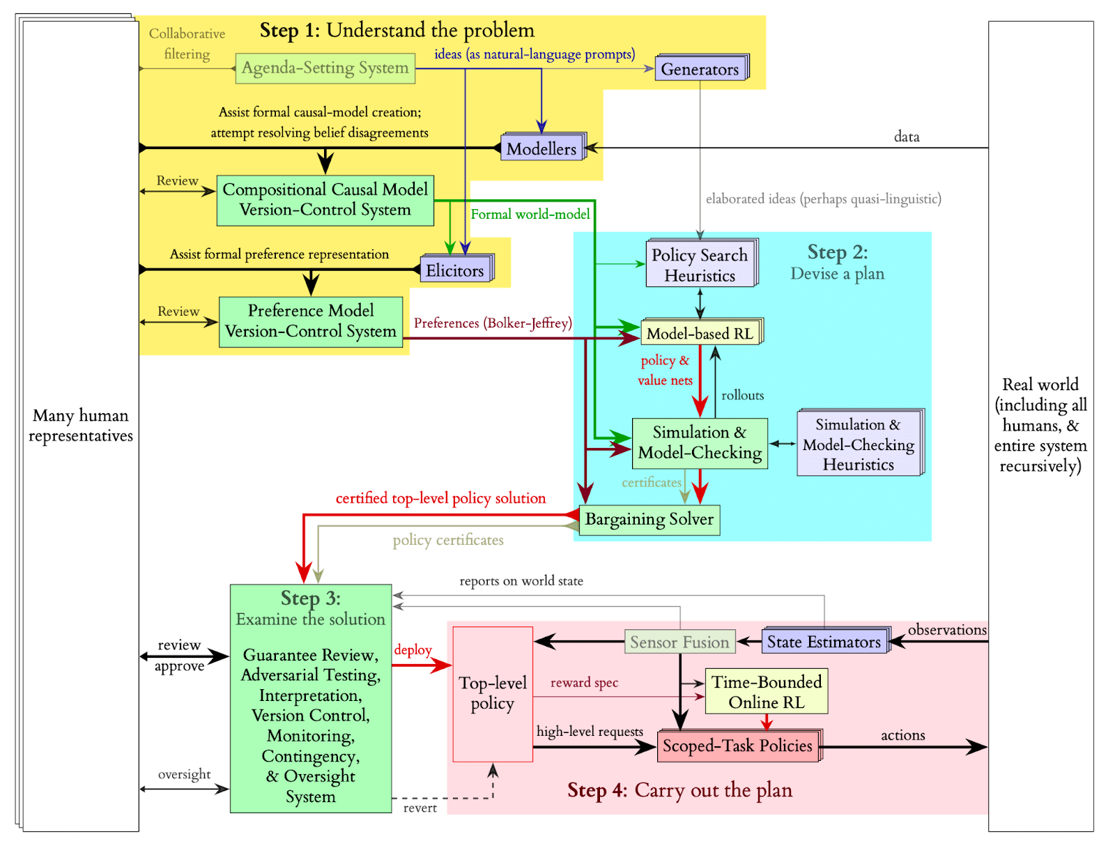 The Open Agency Architecture (OAA) proposal by Davidad has been gaining traction as a conceptual architecture to allow humanity to benefit from the nearly boundless upsides of AI while rigorously limiting its risks. As quoted here, the tl;dr is to “utilise near-AGIs to build a detailed world simulation, train and formally verify within it that the AI adheres to coarse preferences and avoids catastrophic outcomes.”