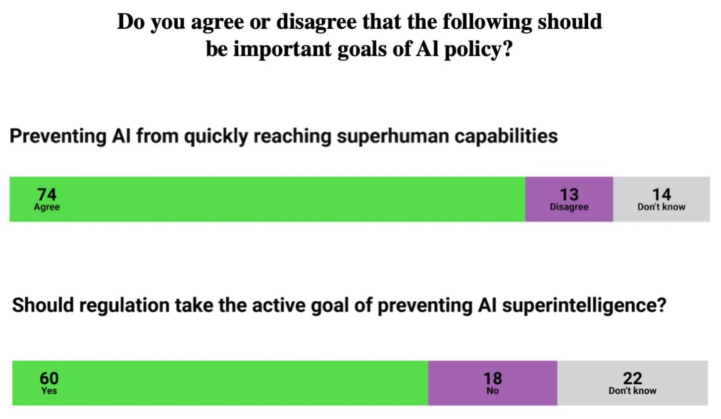 A recent poll of UK voters suggests that most would support stronger action by the government to prevent the development of superhuman AI systems. Source.