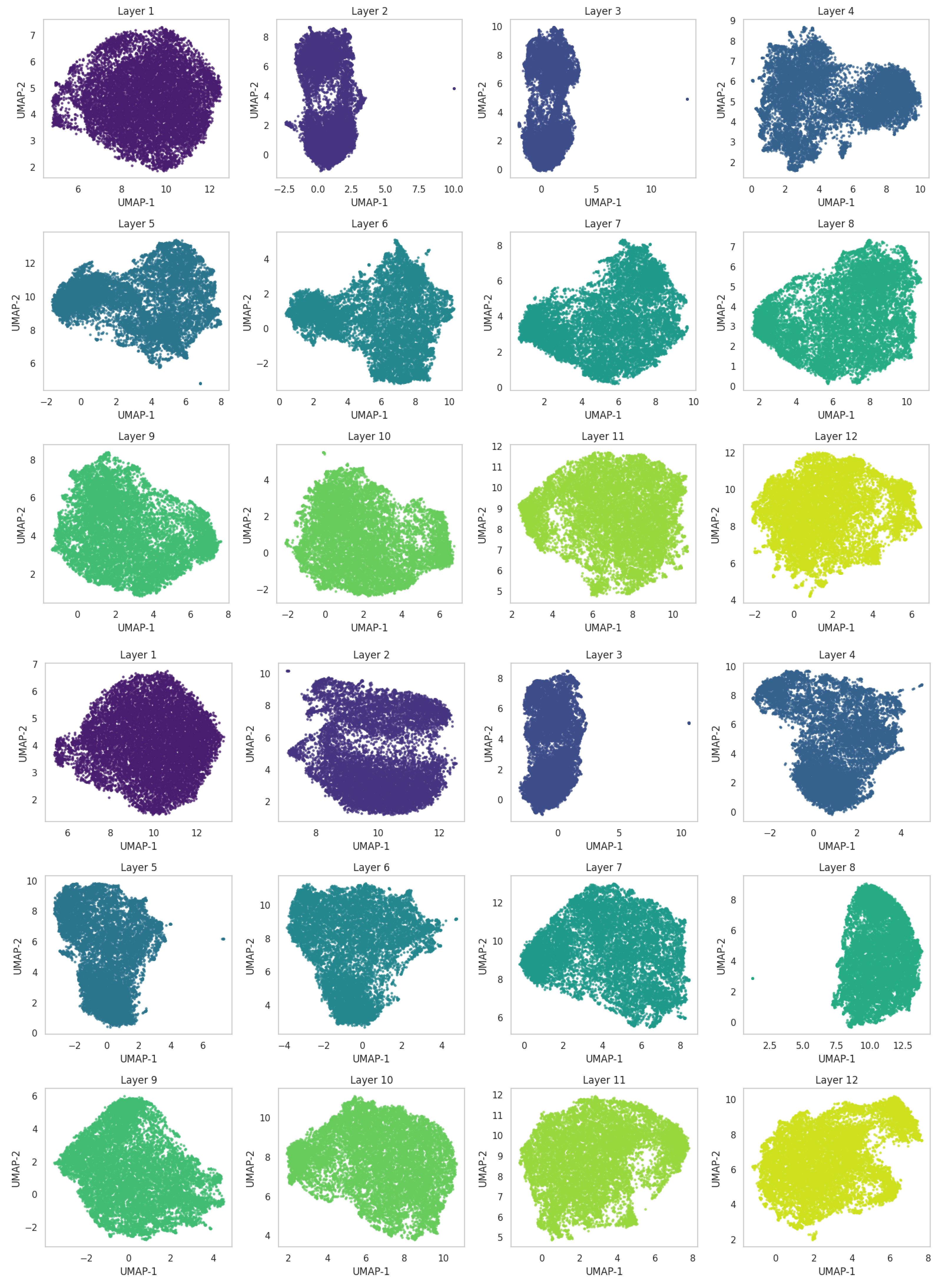 Dual Feature Sets: A separation into two distinct feature sets is evident in the early layers.