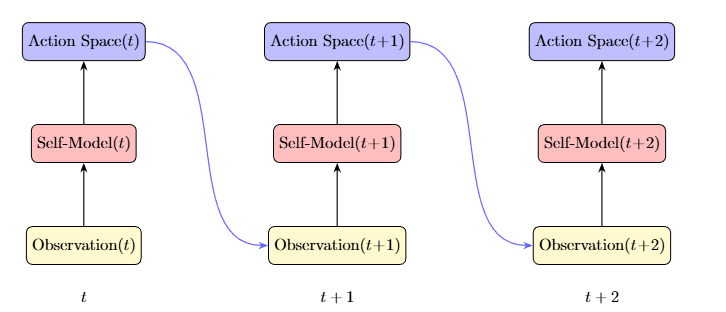 Your current self-model generates your action space—what actions you even consider taking. Those actions generate observations. Those observations update the self-model. Yet, the observations you can receive are constrained by the actions you took, which were constrained by the self-model you had. The self-model isn’t just being updated by the world; it’s being updated by a world filtered through itself.