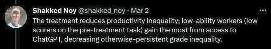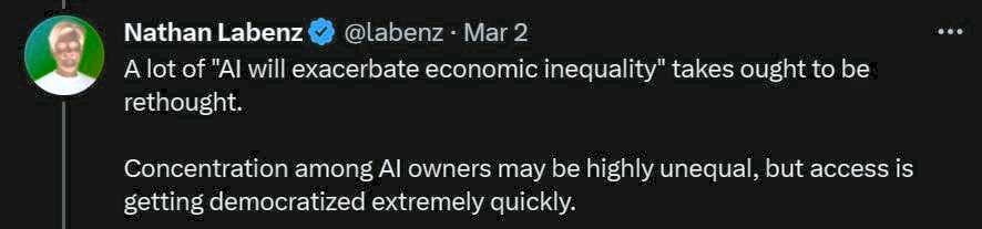 That does not tell us much about the impact on equality. The takes that were based on ‘the poor won’t be able to afford AI chat’ I suppose make slightly less sense than they did a week ago, but how much sense did they make a week ago? That was always going to be a great equalizing factor.