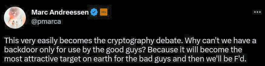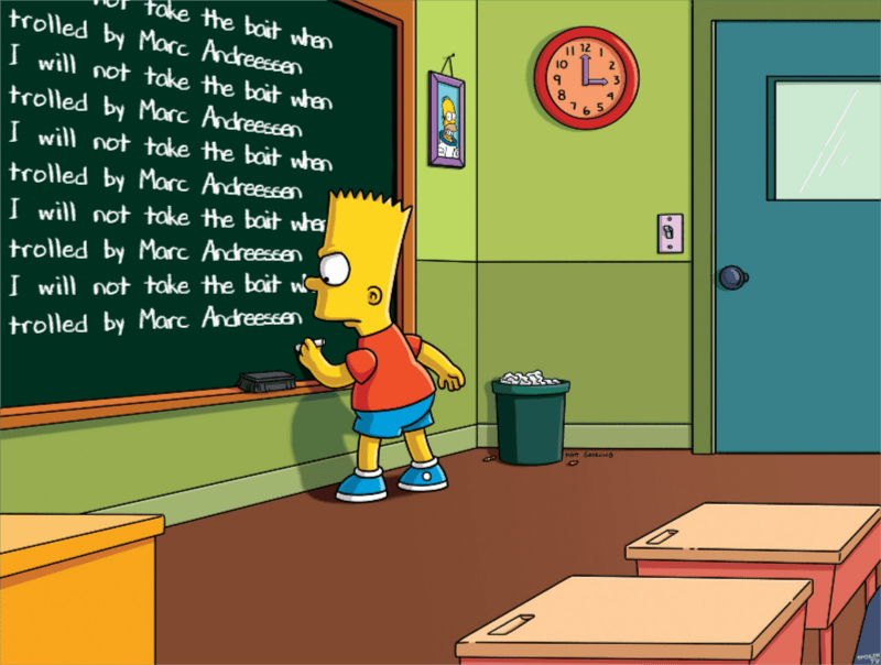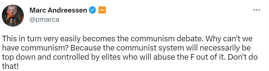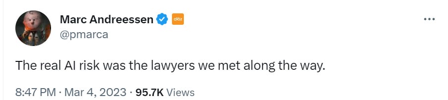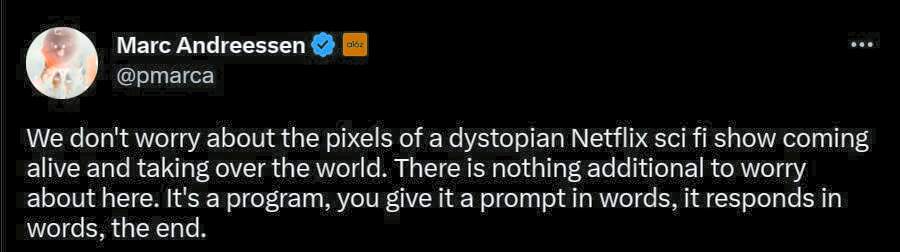 That is very different. I suppose you could think Eliezer’s episode of Bankless was great entertainment – you get to watch these two helpless crypto bros process Eliezer’s claims that the world is ending, taking the arguments seriously, while Eliezer swats down any and all attempted reassurances like they are flies. Perhaps Marc knows the good arguments why one not only should be far less worried than Eliezer, but should not be worried at all. Which, I admit, would make this pretty funny. I have no idea which arguments those would be in his case.