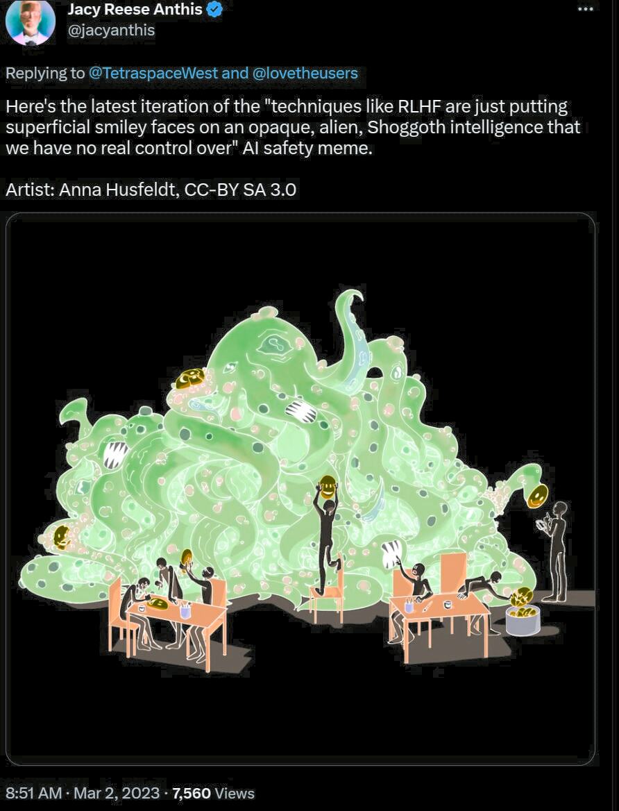 Latest iteration of ‘putting smiley faces on an alien being’ analogy for RLHF.