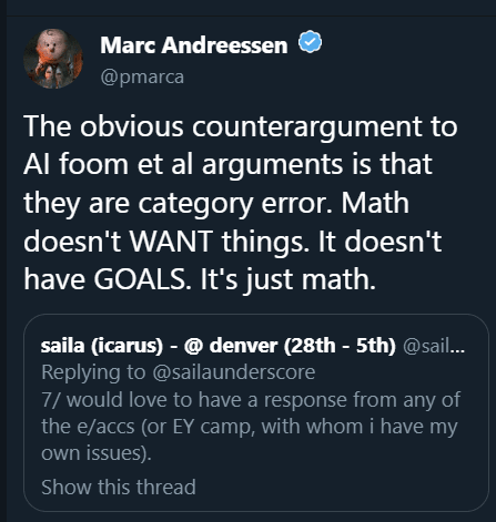 Marc also quote tweets with the ‘100’ emoji the toaster explanation of the Waluigi Effect. Marc knows quite a lot about AI, and about the arguments regarding whether AI is safe. I am sure he knows the good arguments for the skeptical position regarding the magnitude of AI risk.