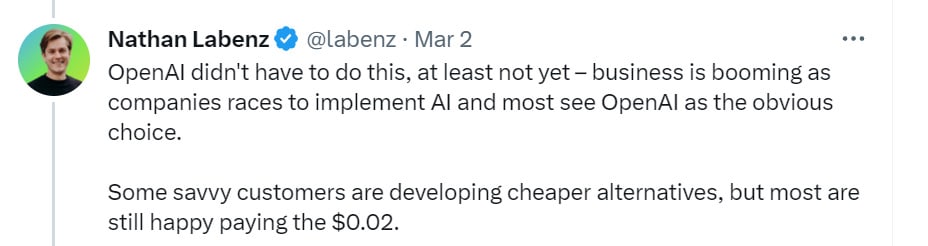 I would not be at all surprised if it turns out OpenAI is for now losing money on every API call even without fixed costs. Why do they care, if they have Microsoft’s pockets? Their volume now is nothing compared to what they’ll be doing two or three years from now, or even one.