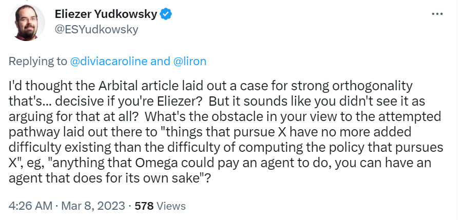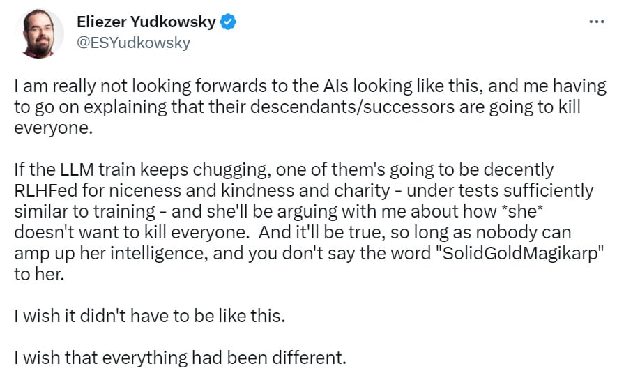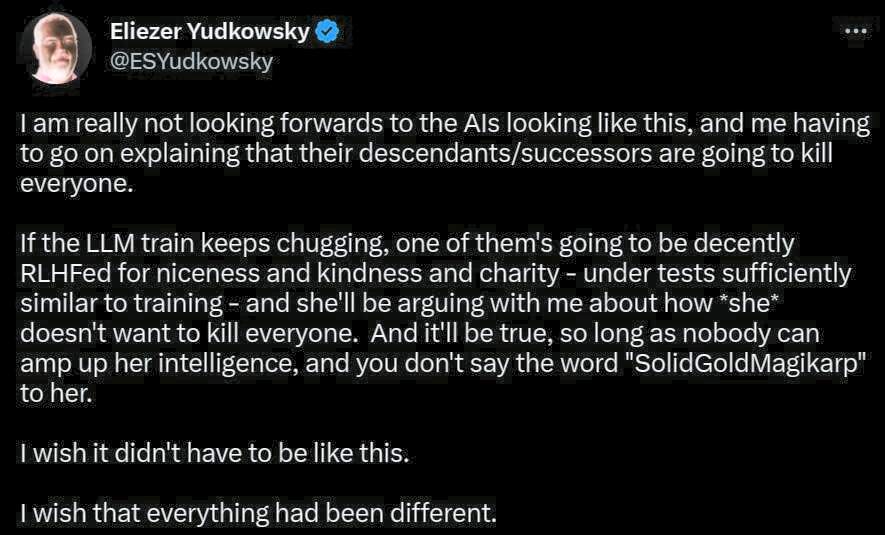 I have listened to hours of his content on podcasts, where he is consistently interesting, and read years of his Tweets – he’s quite a good follow if you have the right sense of humor – and I haven’t heard him make any real non-trolling arguments about why AI would be safe in the important, NotKillEveryoneism sense.