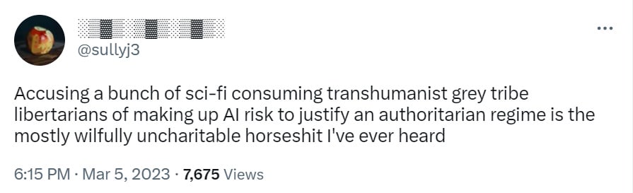 Intentionally not linking since it’s a flat out hit piece, but there’s a completely ludicrous Bloomberg article called “Silicon Valley’s Obsession With Killer Rogue AI Helps Bury Bad Behavior.” The central thesis is that there is a community of people working on what they see as saving the world, and that’s terrible. Even worse, some people in that community did bad things or had bad experiences, and that wasn’t treated as the most important thing. Someone who focuses on making sure AI doesn’t kill everyone is like Bostrom’s paperclip maximizer, you see, because both are singularly focused on one thing and don’t care enough about sexual misconduct. I wish I was kidding.
