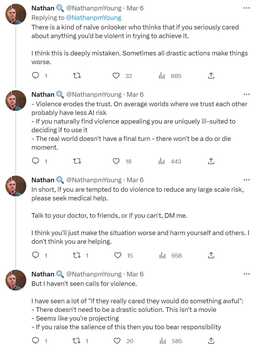 Yes, I too fear that people might be watching, see all these people saying “If you really believed X you would be calling for or choosing violence” and then one or more of them eventually decides that they do believe X and also those people are right.