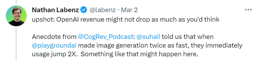 I would draw a distinction between cost and speed. When I make images with PlaygroundAI, time to iterate is often the limiting factor, the process is not that fast. If you cut down generation time by half again, I’d definitely make more pictures, perhaps more than twice as many. If you cut the price of chat, I’m not going to change my consumption because it was already so damn near zero.