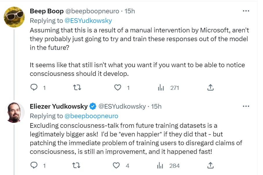 Microsoft only takes hours to address Eliezer’s request that Sydney not claim to be conscious. (#19)