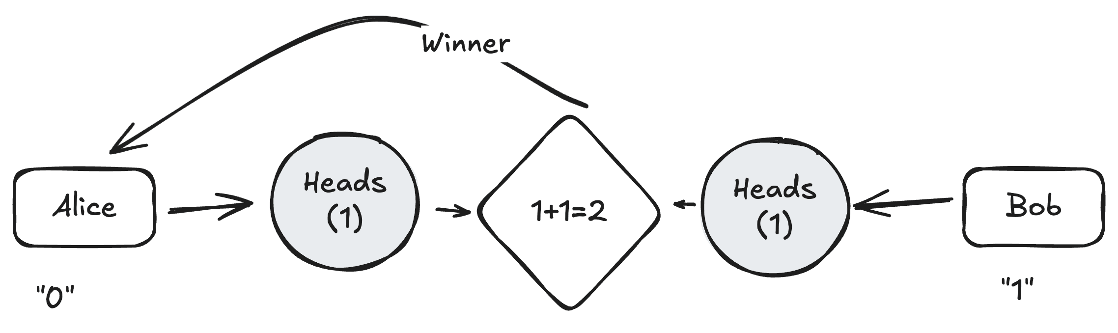 A hash function is a math function that takes some number of inputs and gives us a shorter output. The coins also create a very convenient hash function where the output always depends on every input (i.e. you can’t determine the winner from only one coin, you need to know the results for both).