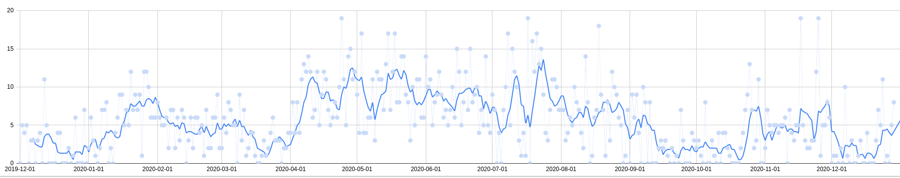 In December of 2019, I started recording how many pomodoros I did each day. I had no expectation that this would last a long time, but it’s now been over a year! I’ve kept a spreadsheet of my daily pomodoros since then, and here’s the graph. I did 2171 pomodoros between 2019-12-01 and 2020-12-29, for an average of 5.5 per day.