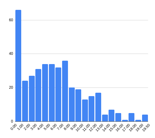 The graph definitely encodes some broad trends, but there is quite a bit of interpretation to be wary of. There were many times when I did work, but didn’t time it. This could be because I forgot, or didn’t realize I was going to do a block of work until I was halfway through it, or because I was collaborating with someone else and our dynamic didn’t need the structure, or because I was doing some physical work where I didn’t really take breaks and having a timer around would be awkward. There was quite a lot of this, and I really wish it was more practical to record all the work I do. At the very least it would make me feel better. There were of course also many times where I worked the whole pom, but did so at a glacial pace, constantly having to force myself to refocus on the task, and getting virtually nothing done for my efforts. Pomodoros are not a measure of output. Lastly, while two poms generally equal an hour of work, the duration do vary.
