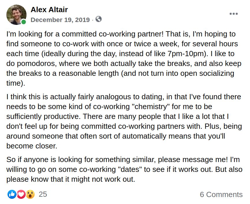 The graph has fairly clear periods of more or less pomodoros. (If someone knows any time-series stats I could run on it, let me know.) As you can see on the graph, I wasn’t doing many pomodoros during the first few weeks. I knew I liked it but needed another structural change to bump up the rate. I had figured out that co-working was a great way for me to be more productive. I didn’t have a full-time job, and I really wanted to find a way to establish regular, habitual co-working. So I made the following post on Facebook.