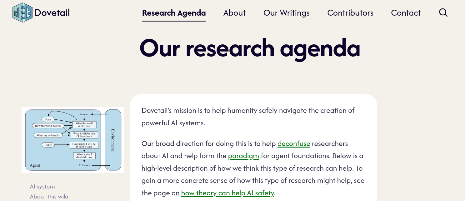 As part of iterating toward leading a research group, I decided to put some more resources into crafting a brand and identity for the group, which I’m calling Dovetail. I want the group to be defined by working on a particular research agenda (rather than by a specific set of people). I have a bunch of opinions about what problems make sense to work on, and there are far more of these problems than I could ever personally work on, hence the delegating to other people. But while I do want to have say over what problems the resources go toward, I don’t think it would make sense for me personally to be the visible focus. Having the group identity helps with that.