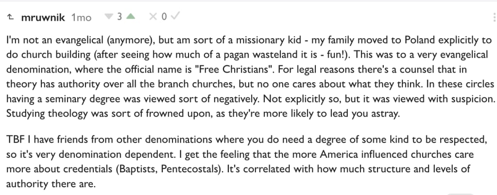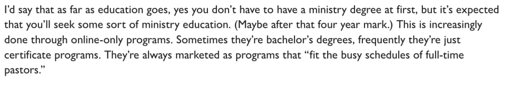 Multiple people mentioned that, in their part of the evangelosphere, seminary degrees were mandatory. If not a full seminary degree at time of founding, then at least an online certificate within 4 years.