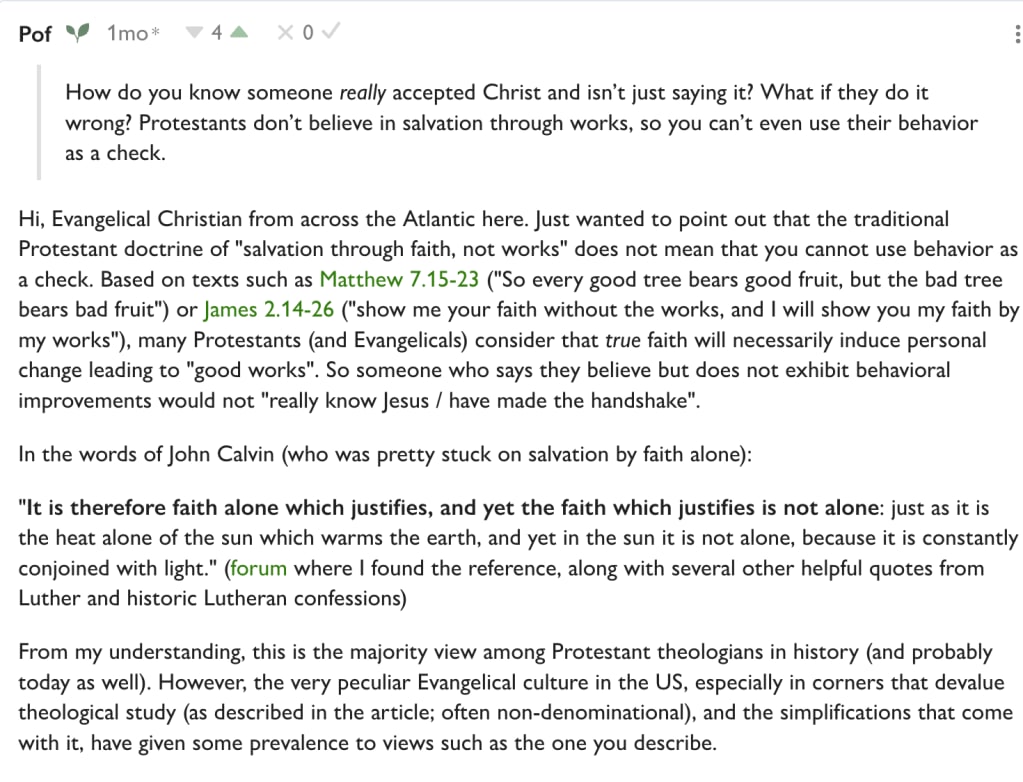 In the previous post I described free grace theology: the idea that salvation requires only the profession of faith, and that good deeds are not only not necessary for salvation, they aren’t even evidence of faith. I represented this as the standard evangelical view, but Pof pushed back that this is an American view. In Europe, FGT is almost unknown.