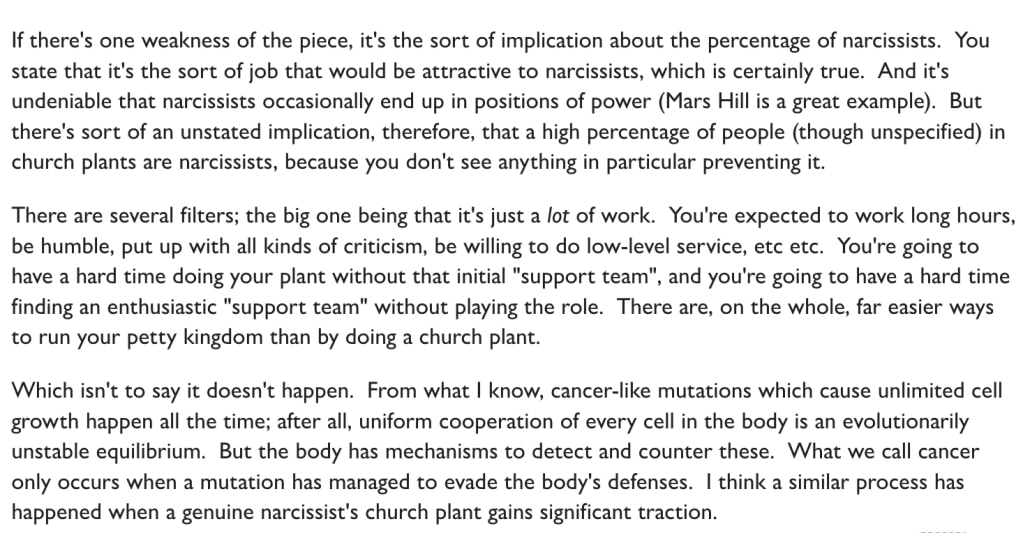When I talked to people about the church planting post, they always wanted to know what got me interested in church planting. The short answer is that I listened to the excellent Rise and Fall of Mars Hill Church podcast, which presents a case study of the harms and benefits of a church plant in order to ask what systems made this possible. But the longer answer is that I spend a lot of time around scared, neurotic people, and it was soothing to listen to voices who were so sure that they were doing what they should be doing and everything would ultimately work out. Even if I disagreed with them on the facts that make them so confident, it was a nice vibe to visit.