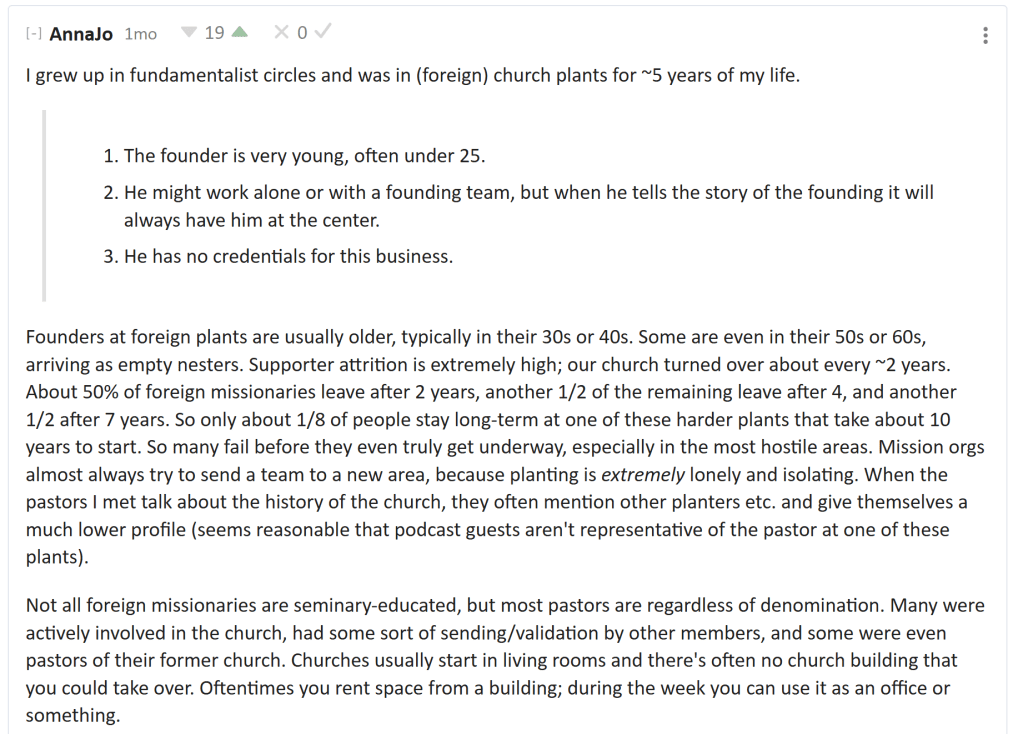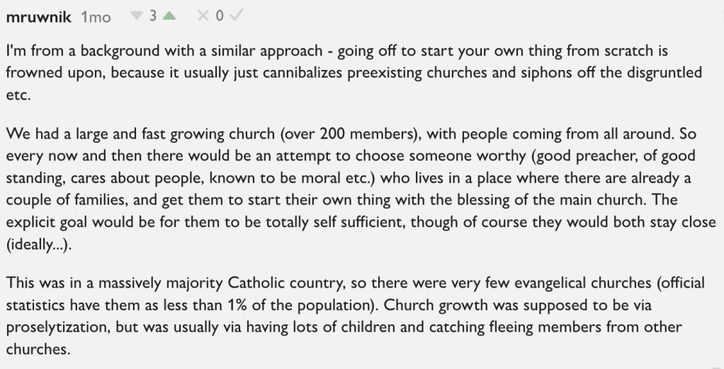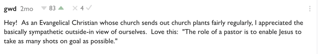 Last summer I got nerdsniped by evangelical christianity, and in particular church planting, the domestic missionary system used by nondenominational churches to resolve the conflict between an abhorrence of hierarchy and a drive to spread the Word. The system was so different from what I expected from religion; I wanted to understand the frame that made it make sense to its members. What I found were values and mechanisms nearly identical to Silicon Valley’s start-up/venture capital culture along with a healthy dose of American “don’t tell me what I can’t do” in ways that warm my libertarian heart.