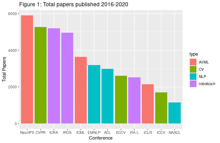 By far the largest subfield within machine learning is computer vision (CV), with the Conference on Computer Vision and Pattern Recognition (CVPR) being by far the most influential conference in machine learning in terms of the number of citations. Natural language processing (NLP) is much smaller than computer vision, with the largest conference, the Proceedings of the Association for Computational Linguistics (ACL), getting about a fifth the total citations of CVPR. Even smaller than NLP are reinforcement learning and robotics. The most influential conference in this area is the IEEE International Conference on Robotics and Automation (ICRA), which receives slightly more than half the citations of ACL (so an order of magnitude less than CVPR). There are also three conferences that publish many kinds of ML research: the International Conference on Learning Representations (ICLR), Neural Information Processing Systems (NeurIPS), and the International Conference on Machine Learning (ICML). These conferences can contain NLP, CV, and RL, and all rank in the top four conferences along with CVPR.