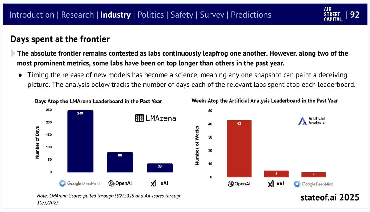 Nathan Benaich: The frontier fight is relentless. @OpenAI still tops most leaderboards, but @GoogleDeepMind‘s stays there longer. Timing releases has become its own science…not least informing financing rounds like clockwork.
