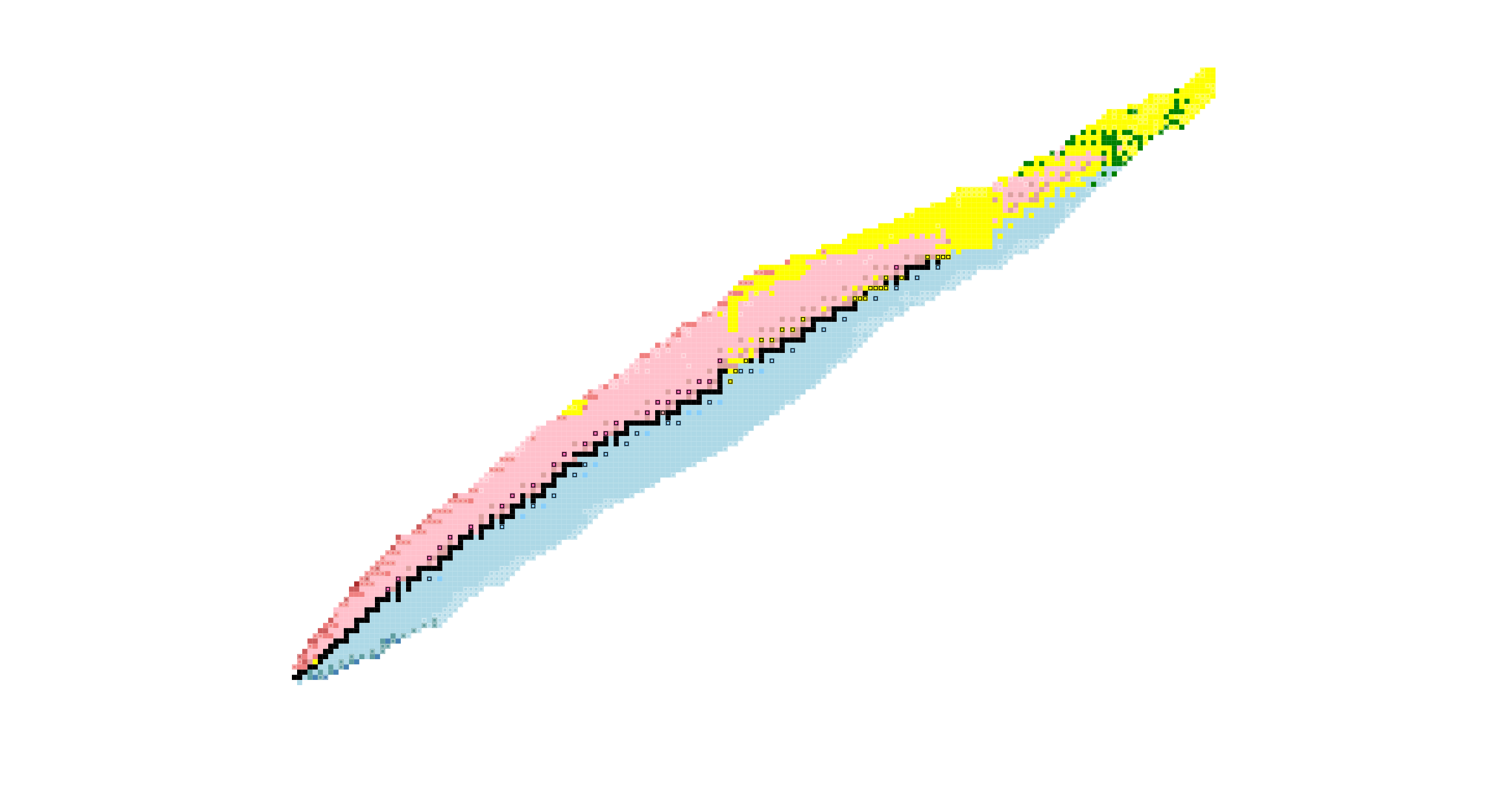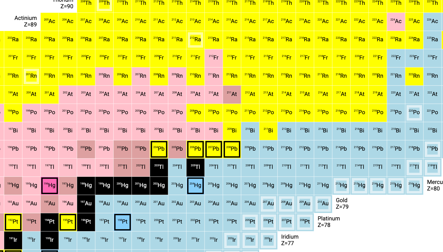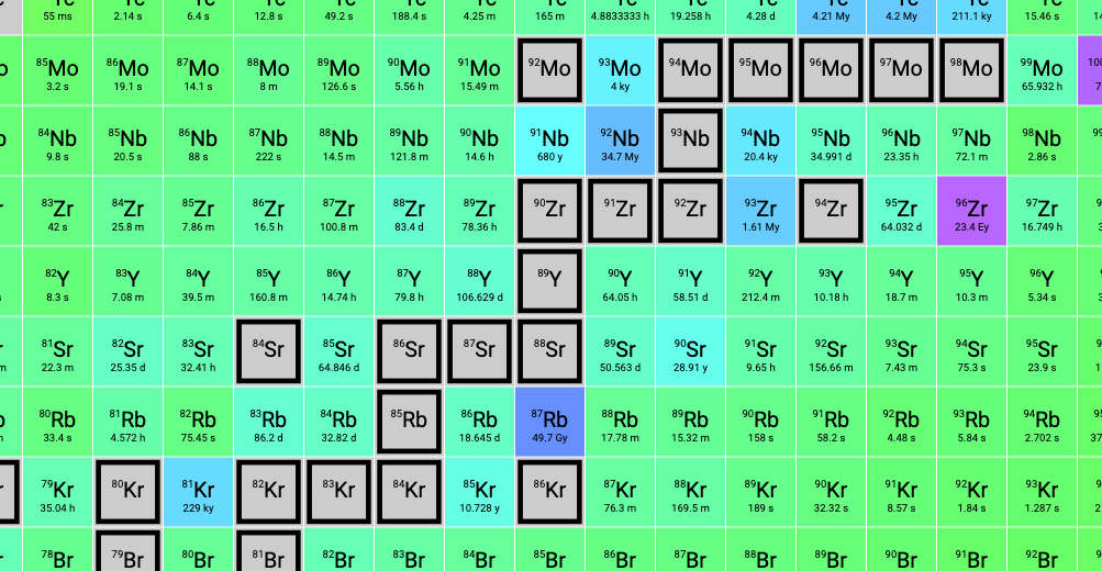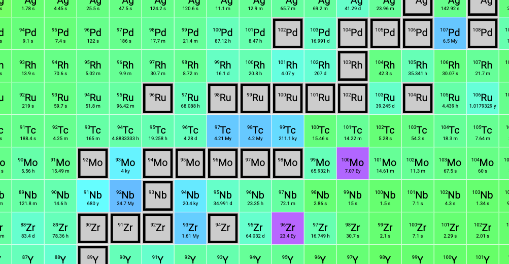 Here’s the table colored by half-life instead of decay mode. Again, the black cells are stable; the lighter colors represent shorter half-lives: