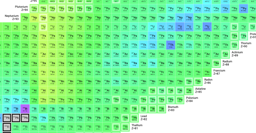Oh, there are a few heavier elements with isotopes long-lived enough to be found in nature—such as uranium-238, with a half-life of about the age of the Earth, or thorium-232, with a half-life of about the age of the universe. But venture much beyond those, and there’s nothing but crazy-unstable superheavy elements.