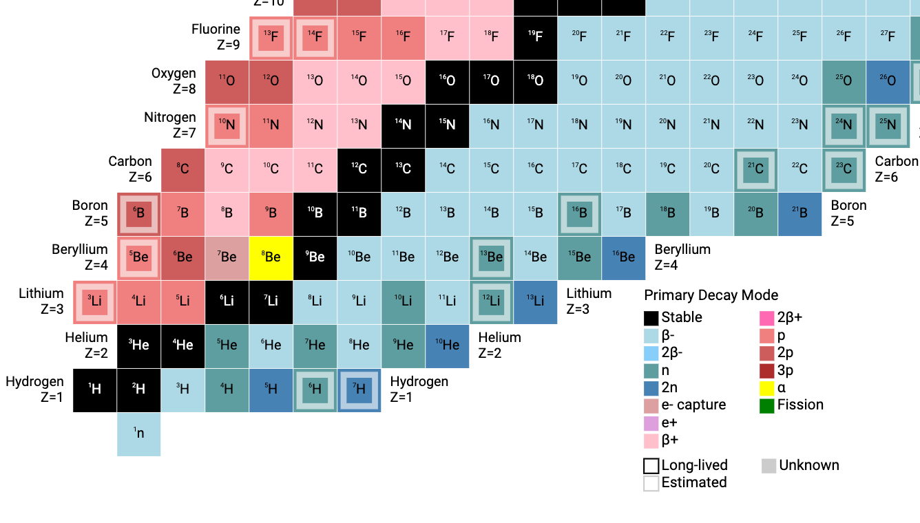 In this rendering of the chart, black squares are stable; light blue ones undergo beta decay; pink ones undergo electron capture or β+ decay. In extreme cases, a nucleus will directly spit out a proton or a neutron (or even more than one). Those are the darker blue-green and pink cells of the table.