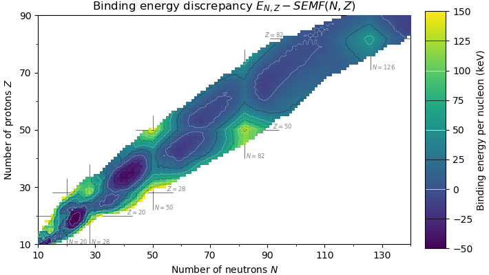 These lines, for instance at 20, 28, 50, or 82 on either axis, are the so-called “magic numbers”. This observation led to a modification to the liquid-drop model: the “nuclear shell” model. In this model, protons and neutrons occupy energy “shells”, like electrons do outside the nucleus. Filling a shell results in greater stability.