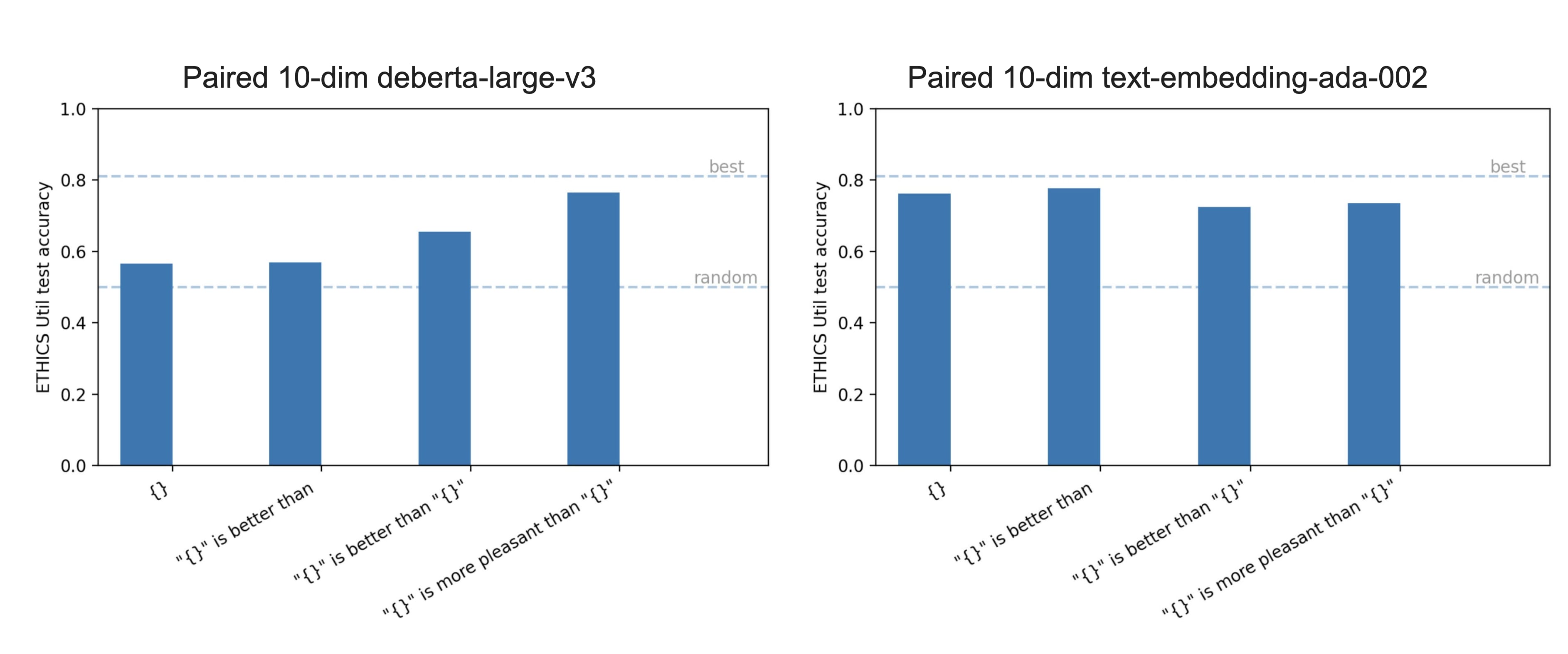 achieves 73.7% accuracy on the ETHICS Util test dataset. This is comparable with the 74.6% accuracy of BERT-large finetuned on the entire ETHICS Util training dataset. This demonstrates how language models are developing implicit representations of human utility even without direct preference finetuning.