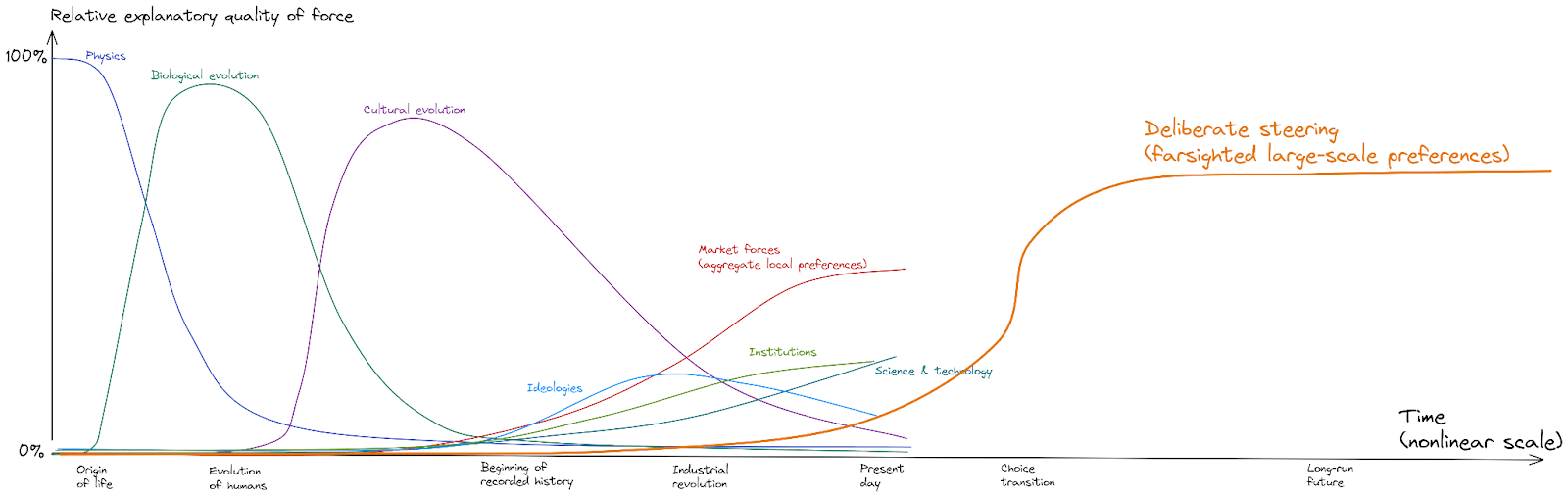 But what if someone (us?) could change this paradigm? Consider deliberate steering — the exertion of effort on behalf of large-scale preferences, in a way farsighted enough to anticipate the dynamics between future forces.