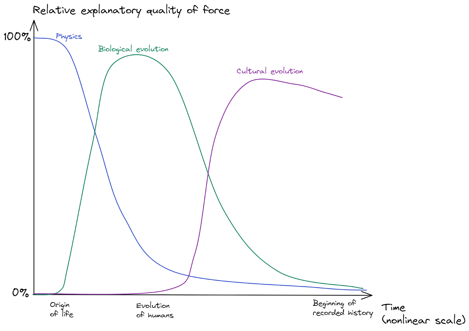 One thing that we can do is ask “if you were explaining things[2], which forces would be predominant in the explanations?”. The best explanations change over time as the operant forces change. This helps us to pick out the simple driving patterns. Physics led to self-replicating molecules, which gave us biological life. Biological evolution was, with the rise of humans, overtaken as the major explanatory force by cultural evolution.[3]