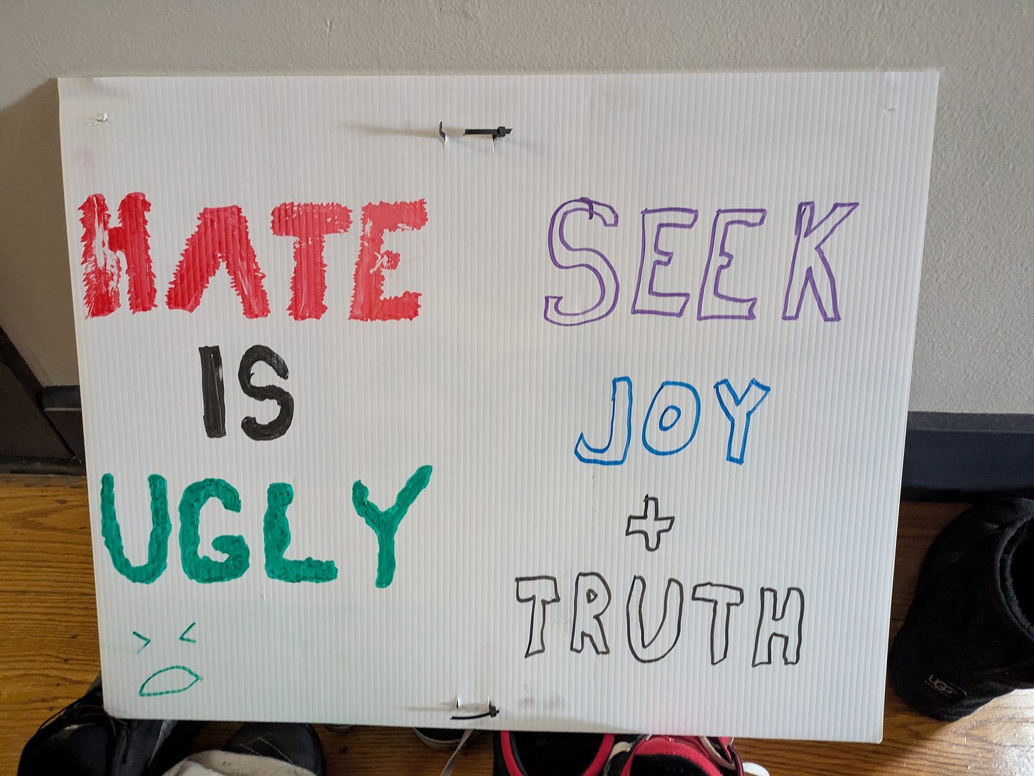 I want to point at the hate directly. My first sign attempt included “Hate is Ugly.” But that is cliche and doesn’t really communicate anything. Anyone could say it. More importantly, I don’t believe that hate is always wrong. It’s good to hate certain things. Nazis. Criminals. Two-Boxers. If you don’t hate anything then you don’t love anything either. The problem is that blanket hate of billionaires is bad. I want to point at the fact that the hate is destructive and stupid rather than appropriately defensive.