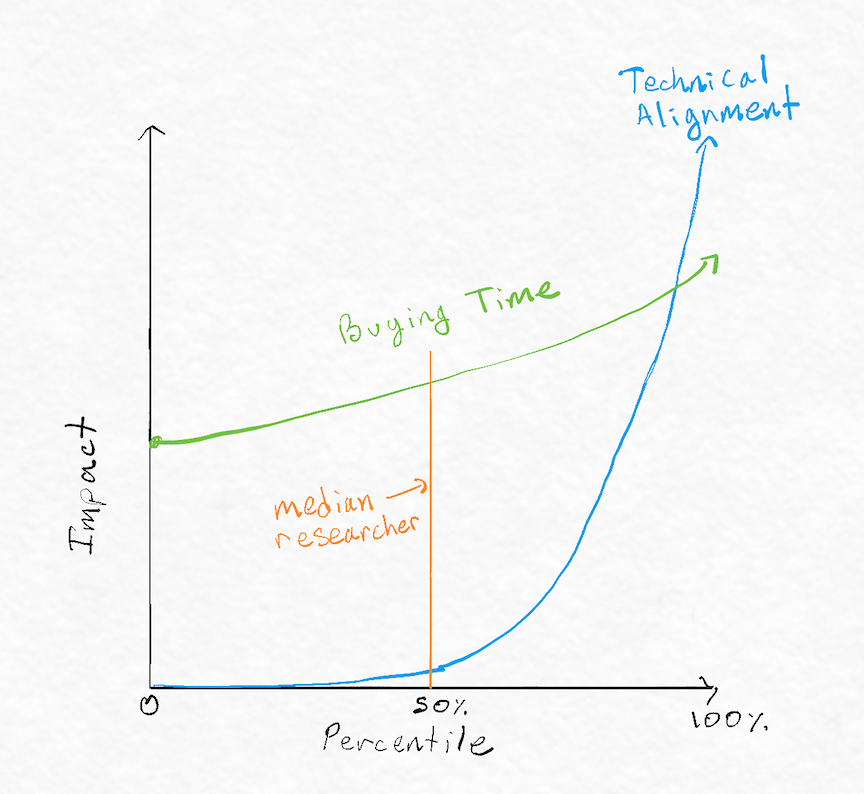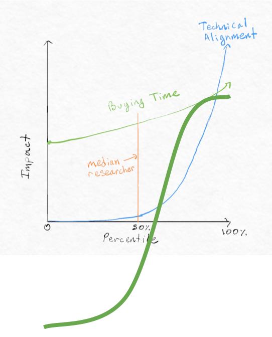 3. Alignment research seems heavy-tailed. It’s often easy to identify whether or not someone has a reasonable chance of being at the tail (e.g., after 6-12 months of trying to solve alignment). People who are somewhat likely to be at the tail should keep doing alignment research; other people should buy time.