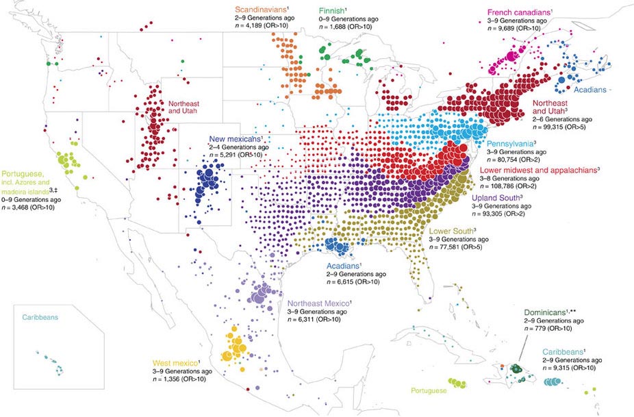 Now Han et al take this field high-tech with the publication of Clustering Of 770,000 Genomes Reveals Post-Colonial Population Structure Of North America (h/t gwern, werttrew)