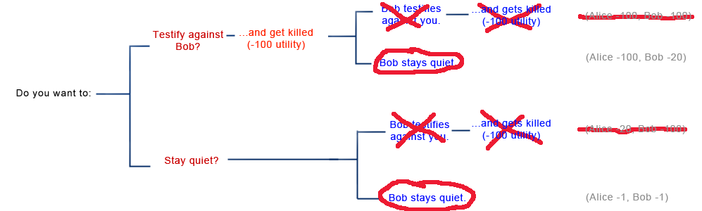 Game theory is the correct way to go from payoff matrices to courses of action, but the issue is that the payoff matrices are subjective. Consider one gamble, in which you and your partner both go free with 95% probability and both go to prison for 20 years with 5% probability. Would you be indifferent between that and it being certain that you would go to prison for 1 year and your partner would go to prison for 20 years? The Alice and Bob Yvain described would be. It’s what they really want. Is it any surprise that the right play for monsters like that is to defect?