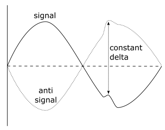 Instead of interpreting the signal relative to ground, we now interpret it relative to the anti-signal. Absolute magnitude is unimportant, what matters is the delta. Now when we get interference, it still shifts our signal, but it makes an almost identical change to our anti-signal, and the difference between the two signals is almost unchanged: