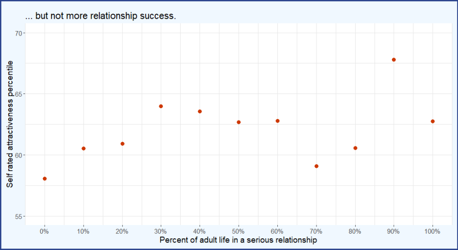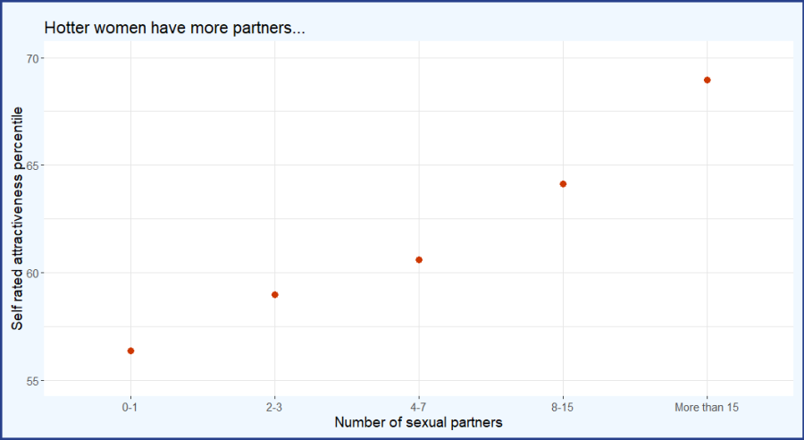 A woman’s self-rated attractiveness predicts her number of sexual partners, but not her success at being in serious romantic relationships. The latter is correlated with assertiveness and agreeableness, and of course with age. This matches the preferences reported by men: guys who look for casual sex care more about a partner’s looks than those who look for serious relationships.