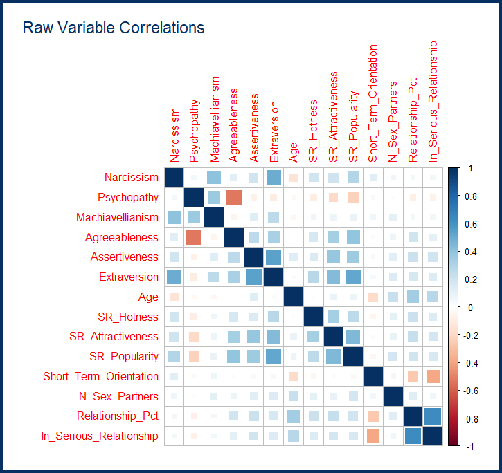 We see some interesting things right away. Narcissism is correlated with attractive traits, but so is agreeableness. As people get older they become less narcissistic and more assertive. Extraversion is great for both friends and lovers. Of course, many of these traits confound each other so we’ll use regressions and controls to tease out the effects.