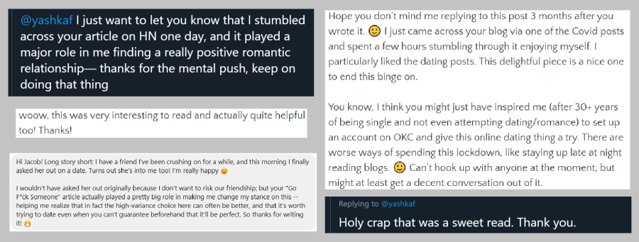 As I said before, my goal with this post was to showcase a lot of information and let the readers draw their own conclusions. Before you do, remember that statistical significance doesn’t imply a huge effect size, that my measures are messy and limited, and that some of the positive results are likely artifacts of noise. My sample also has various selection biases, although if you’re the sort of person who reads Putanumonit you’re probably dating the sort of people who fill out Putanumonit surveys and so these results are very relevant to your own life.