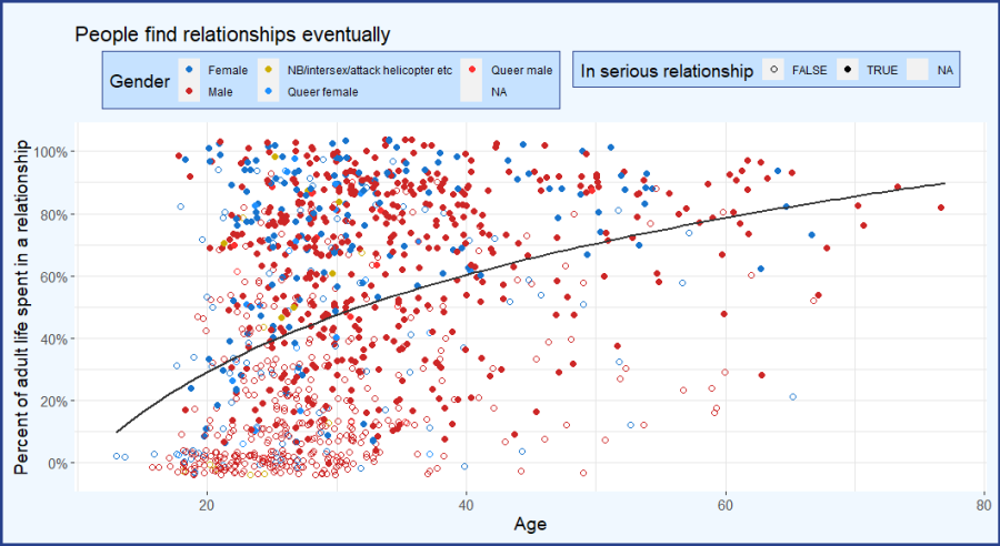 For long-term success, I wanted to combine the questions on current relationship status and overall percent of time in relationships. Looking at a bunch of data like this, it seems that married people should expect 20 more years of marriage and single people should expect to stay unmarried for another 12. I decided to err on the conservative side and just add 15 years of “being in a serious relationship” to those currently in one for the purpose of calculating % of time romantically engaged. So a 33-year who spent half the time since age 18 in a relationship (7.5 years) but is now in a serious one will have that metric upgraded to 75%, since I assume their next 15 will be in a relationship as well.