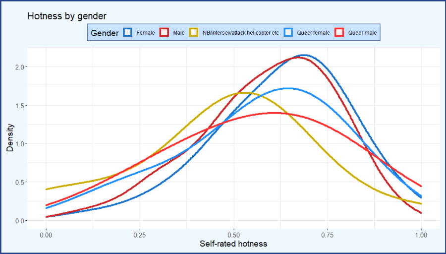 I also asked people to rate themselves on physical attractiveness (hotness), attractive talents, and popularity. My responders are slightly hotter than average according to themselves, and hotter the more cisgendered they are without any difference between men and women.