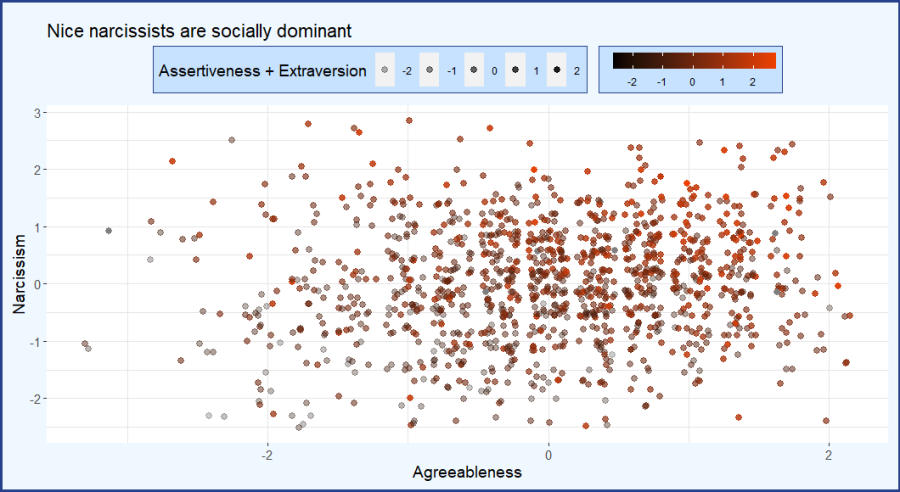 Narcissism and agreeableness are the strongest predictors of social dominance (sum of assertiveness and extraversion), accounting for 25% of the variance in it. You can see on the chart that the bright red dots (for socially dominant people) are concentrated towards the top right corner of those high in both agreeableness and narcissism.