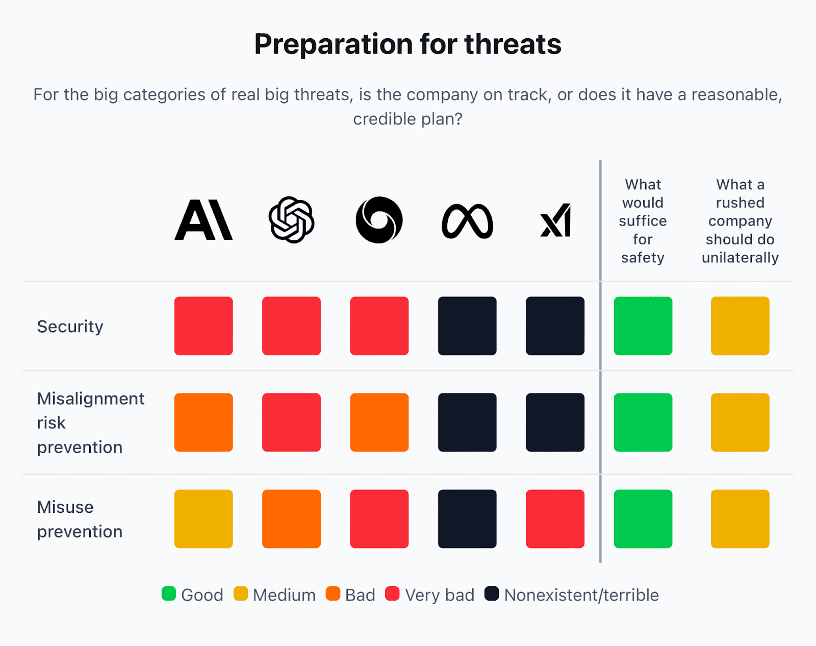 Note that security and misalignment risk prevention are more important and much harder than misuse prevention, in my view, and that they’re largely open problems but companies could be doing much better. Note that companies outside of Anthropic, OpenAI, and DeepMind are doing basically nothing on safety. See also my main scorecard, ailabwatch.org.