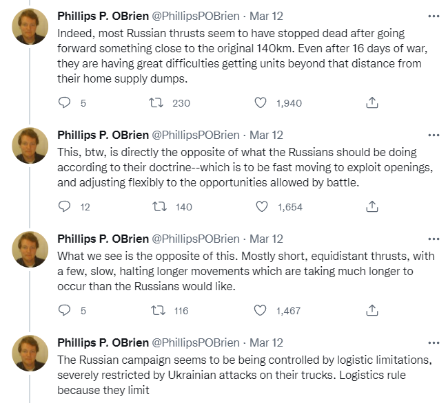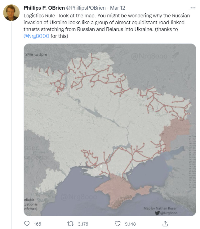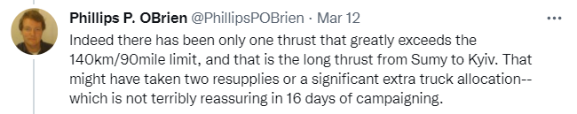 If it is indeed true, then this means that the correct action by Ukraine is mostly what we are seeing. If Russian logistics are not only bad but going to get that much worse over the next few weeks, then counterattacks and otherwise being flashy are unnecessary except to the extent they relieve pressure on civilians. Much better to wait, let Russia continue to exhaust its logistical capacity and overextend.